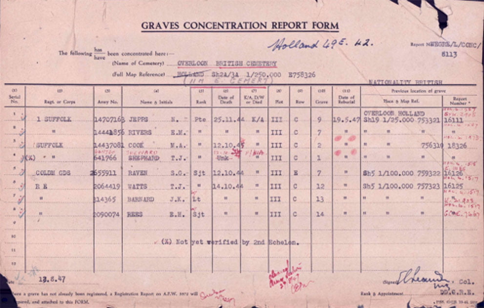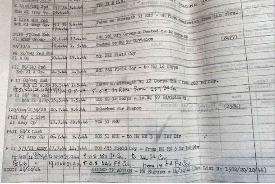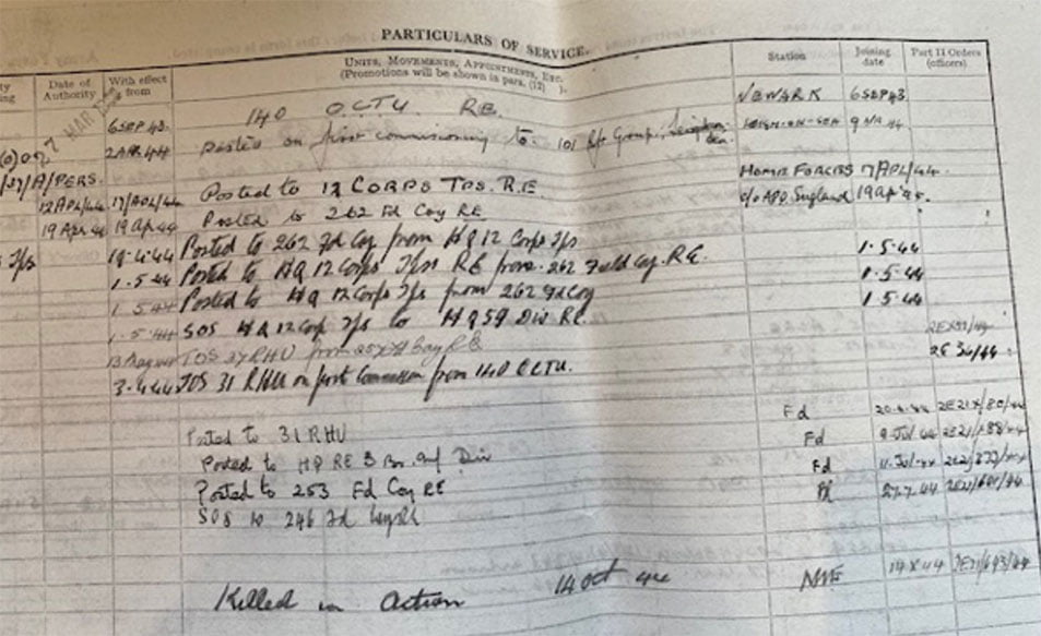 From the 253rd Field Company, he moves to the 246th Field Company on 27 September 1944 and there he finally finds his death near Overloon on 14 October 1944. His death is not recorded in the ‘Particulars of service’ until 19 October 1944.