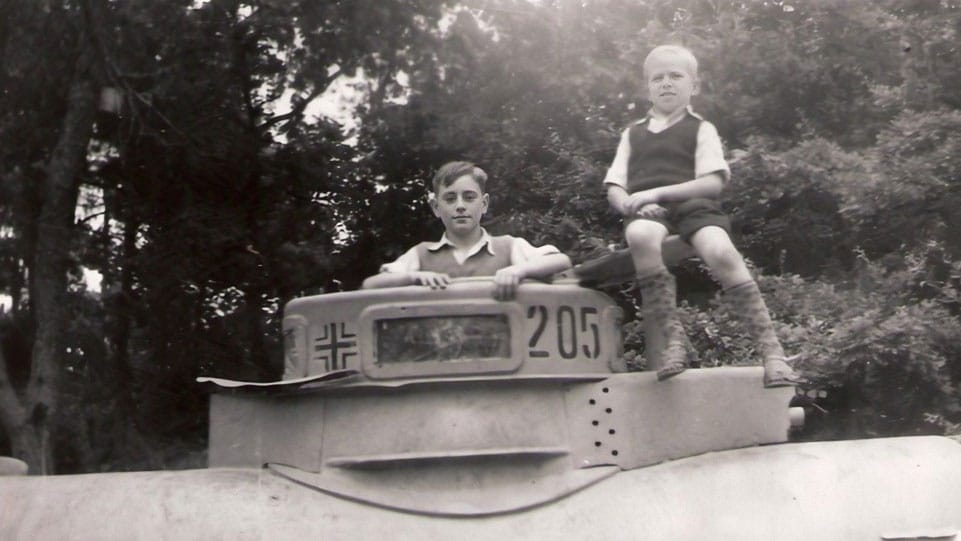 Wil Akkermans and Keith Lucas on one of the tanks left at Overloon in 1950