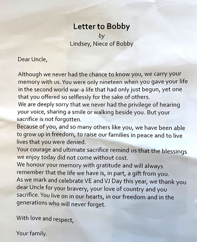 On 3 June 1947, Bobby was reburied in grave IV.E.10 at Overloon War Cemetery.