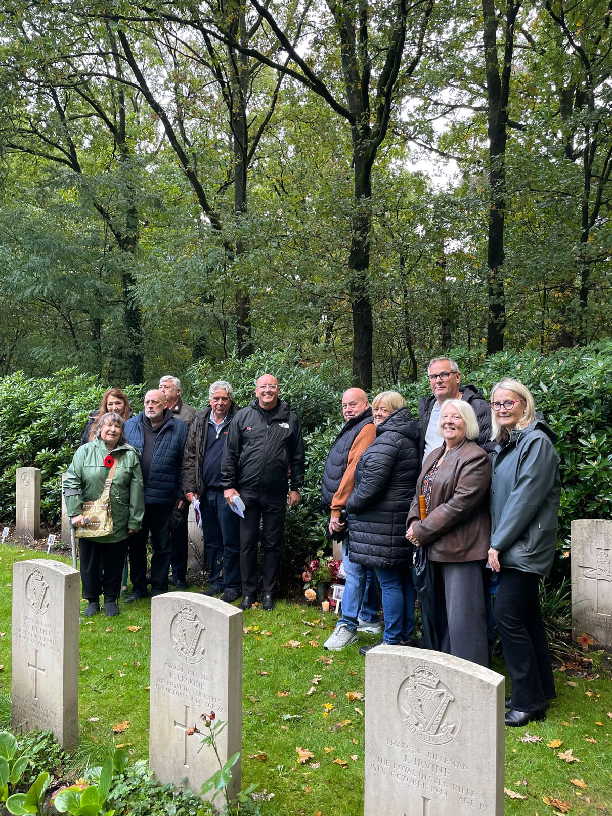 During the weekend of 3-5 October a large group of Bobby Milton’s cousins and nieces visited Overloon. We organized a battlefield tour for them in the Overloon area and took them to the fields in Het Schaartven where Bobby was killed and where he was temporarily buried in a field grave. We also attended an emotional and very beautiful memorial ceremony where the family commemorated their uncle Bobby with beautiful words and music and thanked him for what he meant to freedom but also to his family.
