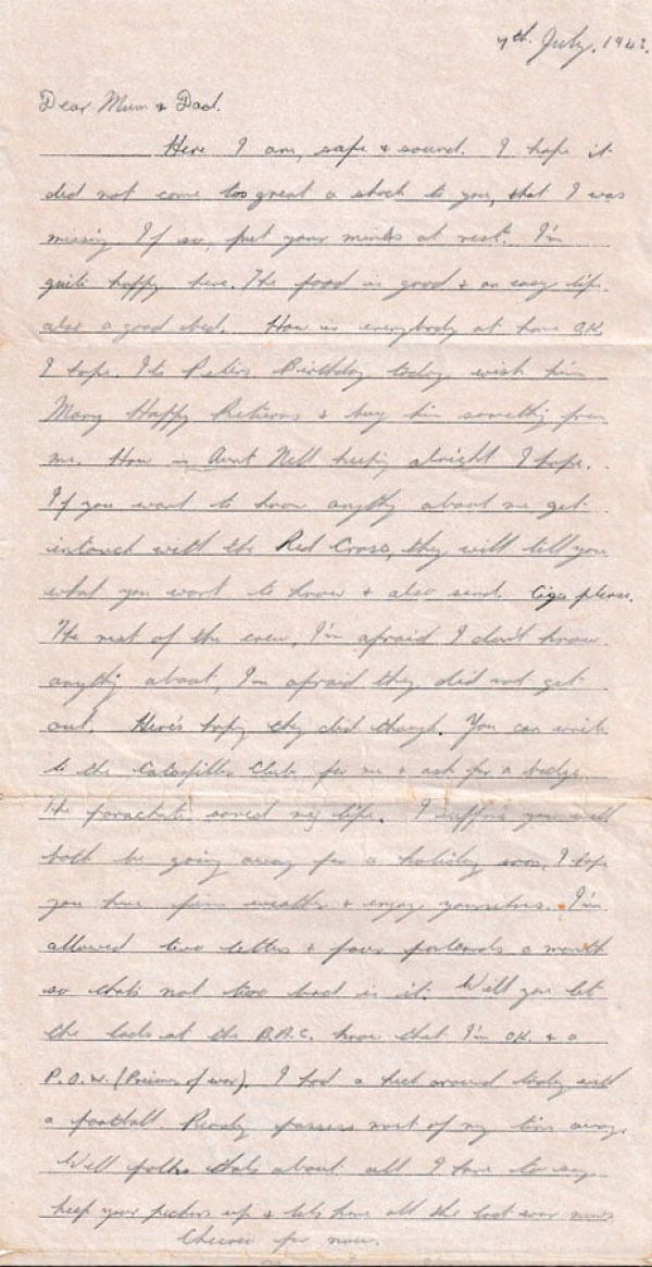 By July 7th 1943 he was able to write the first of many letters and postcards to his mother and father, but also to his future wife, Gwladys Hughes. He was initially taken to Dulag Luft which was in Oberusel just outside Frankfurt. This is where all aircrew were taken initially for processing and interrogation. He reassures his family that he is fine, that he came down without a scratch and that life in the camp wasn’t too bad. He tells them that the aircraft was shot down by Flak. He had bailed out but did not know about the rest of the crew and hopes they are ok. He also says that the parachute saved his life. He even remembers it is his brother’s birthday and asks his parents to buy a present for him from him. He also asks them to let that “the lads at the B.A.C know that I’m OK & a P.O.W..” He tells Gwladys that he hopes she will wait for him, which she clearly did.