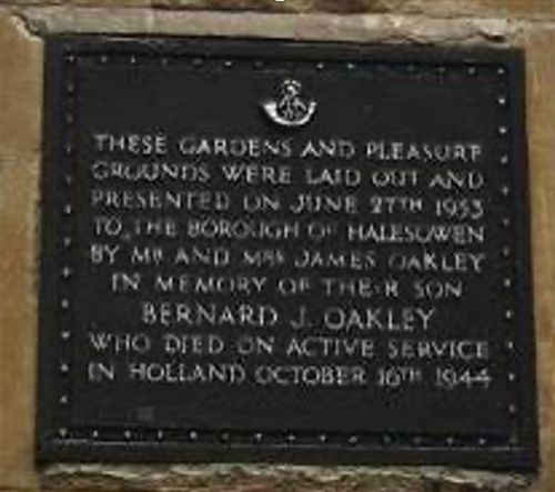 Bernard’s parents donated the Bernard Oakley Memorial Gardens and Pleasure Grounds at Colman Hill, Cradley to Halesowen Borough Council in memory of their son. The land consists of about 3 acres of land situated between Colman Hill and Highfield Crescent in Cradley. It slopes towards Colman Hill and has a southerly aspect. New iron ornamental gates with York stone pillars were erected at the main entrance in Colman Hill. A bronze plate on the stone pillar on the left hand side of the double gate has the following inscription: “These Gardens and Pleasure Grounds were laid out and presented on June 27th, 1953 to the Borough of Halesowen by Mr. and Mrs. James Oakley in memory of their son, Bernard J. Oakley, who died on active service in Holland October 16th, 1944.” On the pillar on the right hand side another bronze plate contains the words. “Greater love hath no man than this, that a man lay down his life for his friends.”—John 15-13.