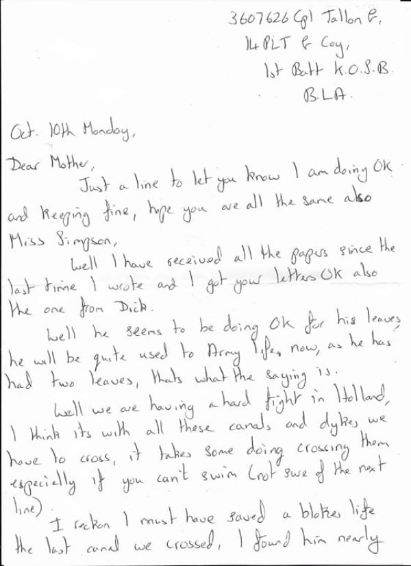 He will not receive his mother’s last letter of 28 October 1944. George Tallon is killed on 1 November 1944 near Vierlingsbeek, presumably west of railway line and east of Overloon.