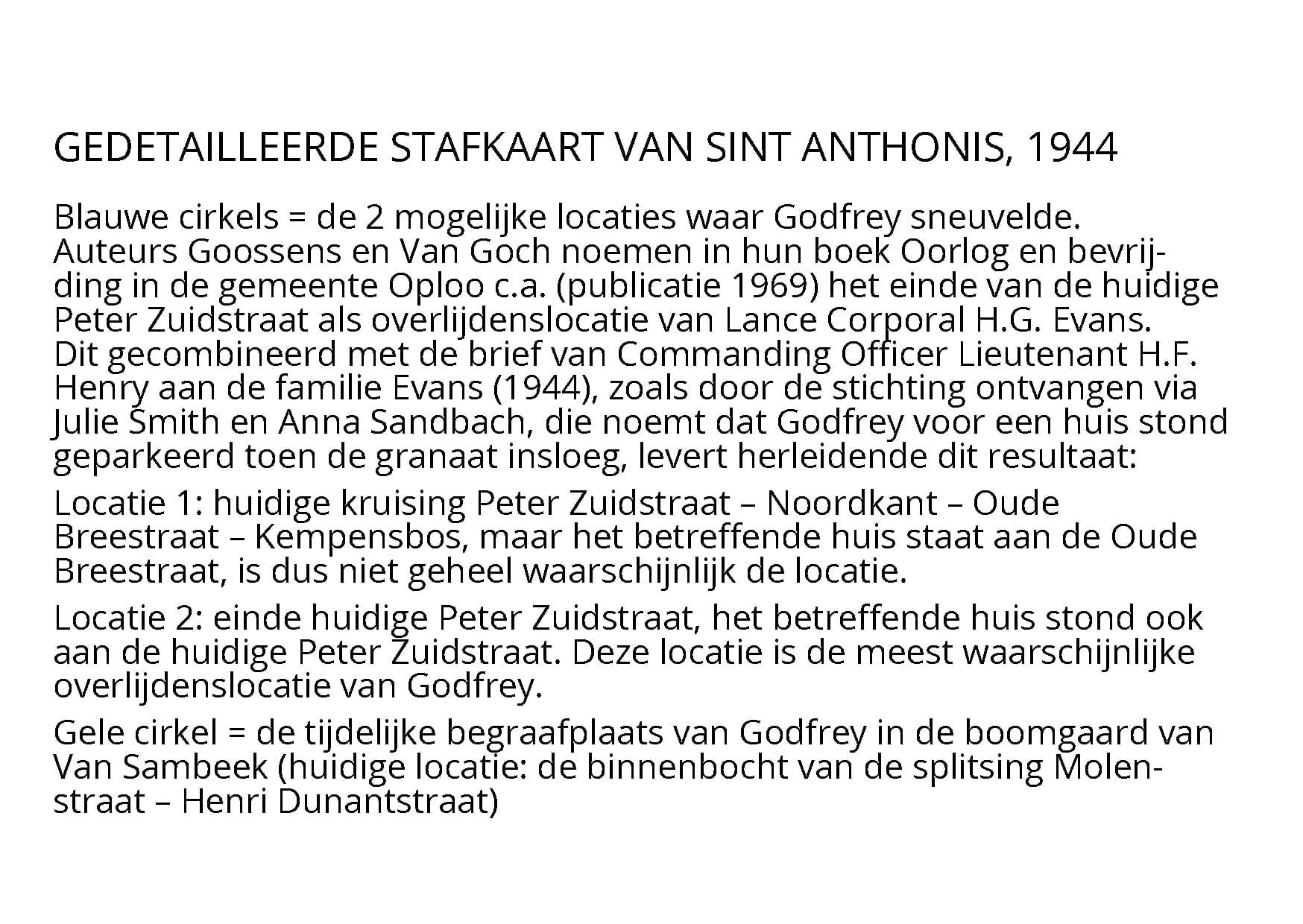 - Evans sneuvelde bij een huis aan de toenmalige Noordkant in Sint Anthonis. Anno nu is die locatie het einde van de Peter Zuidstraat, net voor het begin van de Noordkant. Na de oorlog heeft het eerste deel van de toenmalige Noordkant, startende vanaf het dorpsplein de Brink, de naam gekregen van verzetsleider Peter Zuid. Peter Zuid was de verzetsnaam van Jan Borghouts (1910 – 1966) die tijdens de Tweede Wereldoorlog de gewestelijke sabotagecommandant was van de Binnenlandse Strijdkrachten. Hij leidde het verzet in het zuiden van Nederland en was vanaf december 1944 stafmedewerker van prins Bernhard. Hij leidde de zoektochten naar geschikte onderduikadressen en vluchtroutes, plande sabotageacties en organiseerde de knokploegen. Vanaf maart 1945 verplaatste hij zijn activiteiten naar de provincie Zuid-Holland en werd in zijn functie als stafmedewerker van prins Bernhard betrokken bij de capitulatiebesprekingen met de Duitse bezetter.